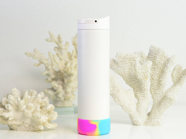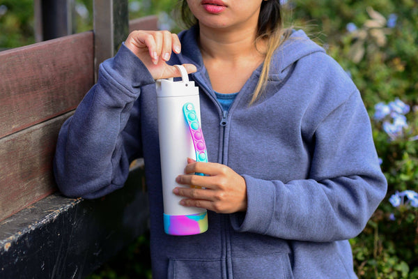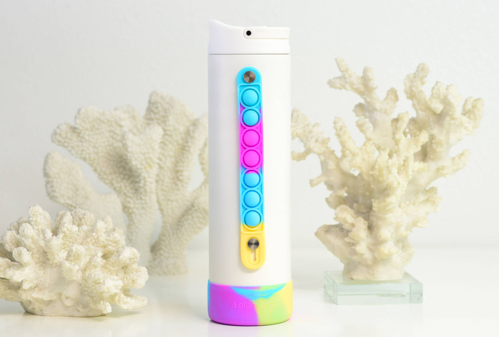 Quench your thirst for exposure with versatility and durability to accommodate all your adventures. This features our newest 20-ounce Iconic Pop Bottle, they're crafted from durable stainless steel. The triple-wall insulated material is BPA-free and keeps drinks cold for up to 24 hours or hot for 12 hours. The Elemental Iconic Pop Bottle comes standard with silicon fidget pop bubbles on the handle that is great for sensory stimulation and stress relief. Includes two reusable straws and an easy-open sports lid. Hold it with its attached adjustable strap or drop it into your car's cup holder. No matter where you go, this bottle is made for convenience.