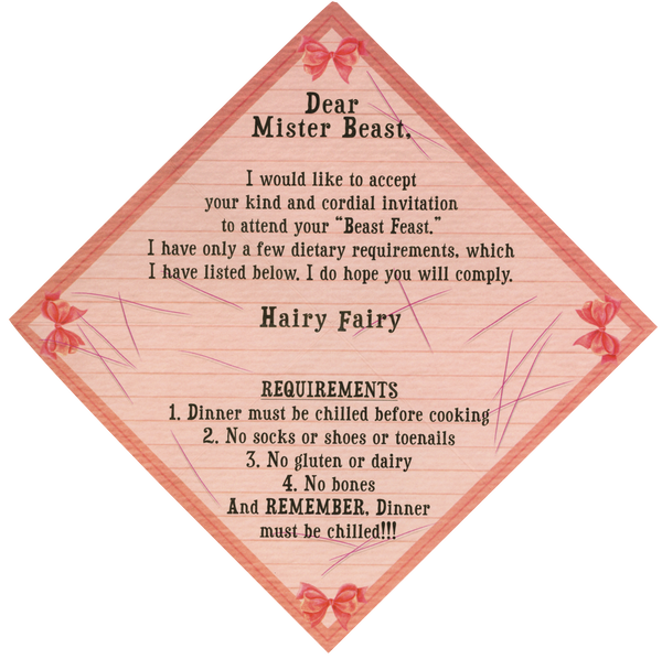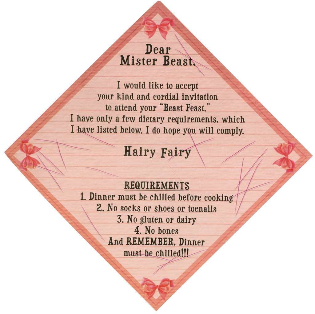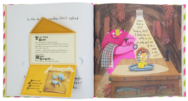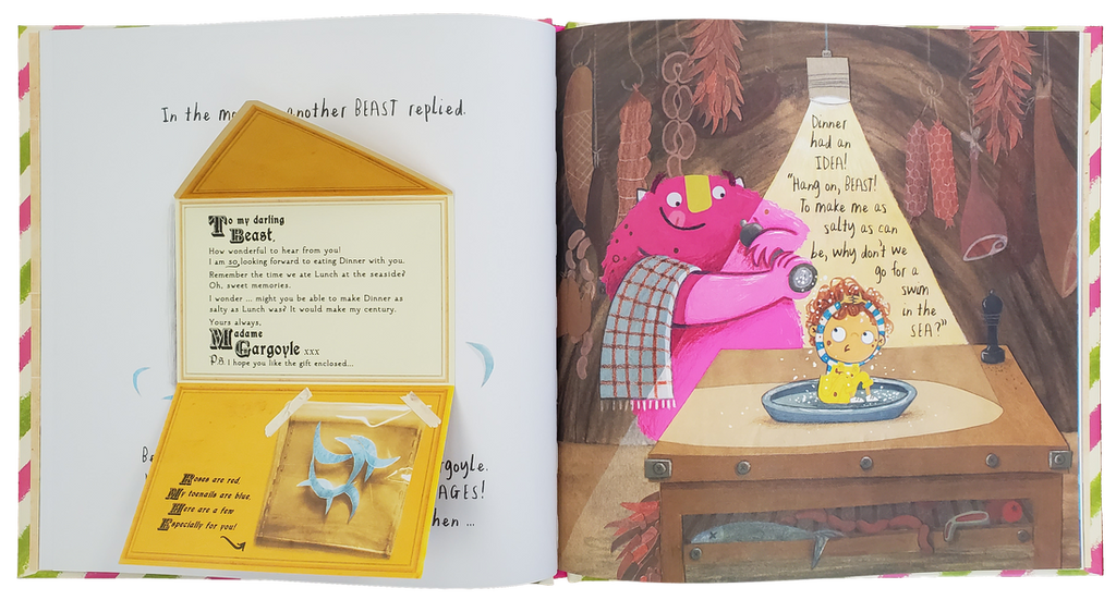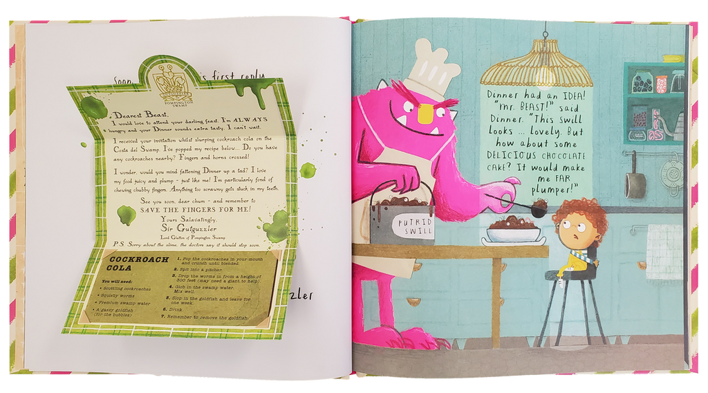 Beast – a beast – plans to eat Dinner – a little boy – at a big feast and sends invitations to all his beastly friends. Readers open the foldout RSVPs to find that everyone is coming (though some do have special dietary requirements)! But don’t worry about Dinner; he’s already got a plan to escape being… dinner.