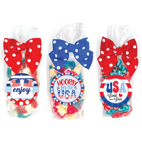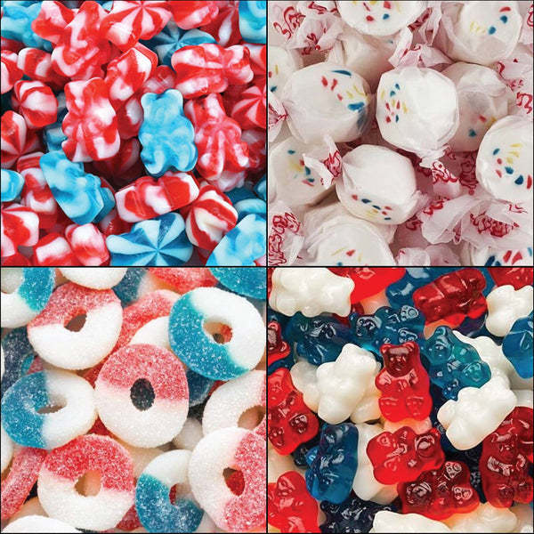 Indulge in the ultimate sweet delight with our perfectly packaged candy bags, designed to make anyone feel special. These delectable red, white & blue candies come in a vibrant assortment of flavors and textures, including gummies, gumballs, salt water taffy, Mix Ups, and chewy sours. To make it even more special, our candies are beautifully complemented by our bright and giftable labels. These labels add a touch of charm and make it the perfect gift for any occasion.