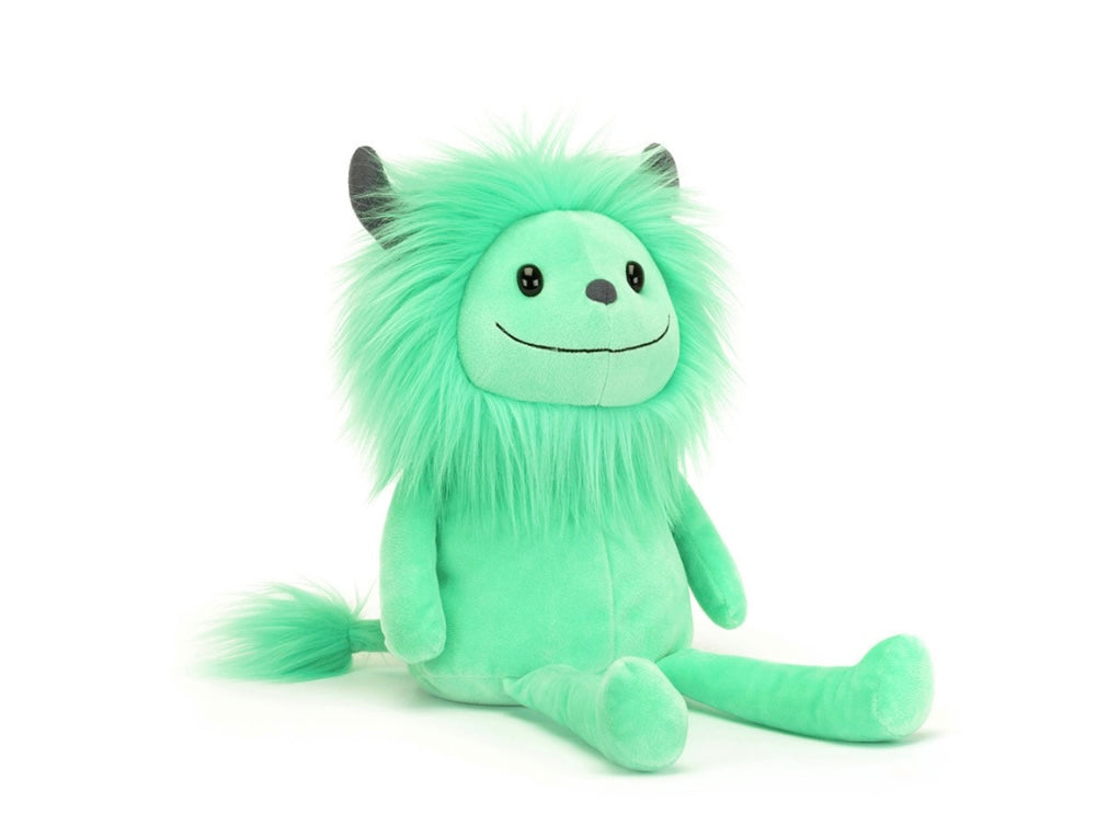 Cosmo Monster is minty-cool, and happy to chill in any snuggly cave! With a scrummy-soft mane and tufty tail, suedey grey horns and skipabout legs, this scamp gives wonderful snuggles. Cosmo prefers sleeping on the pillow to hiding under the bed - very odd for a monster!