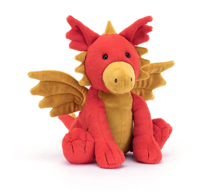 Bold and bright in chilli red fur, Darvin Dragon is a mythical marvel. With a cosy turmeric nose and tummy, fluted wings with embroidered swirls, gentle spines, waggly ears and a chunky red wedge tail, this little dragon gives magical cuddles.