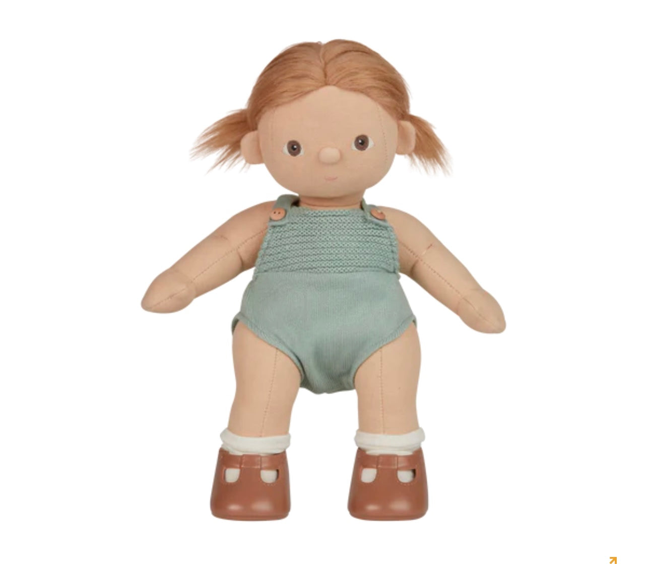 Gigi is all softness and sunshine! With her golden hair and cuddly body, Gigi’s as soft as a sunny day. She’s all dressed up in a powder-blue romper, complete with tiny wooden buttons and velcro fastenings, perfect for easy outfit changes. From giggles and games to bedtime snuggles, Gigi is more than a doll—she’s a playful pal and the cosiest companion for your little dreamer.