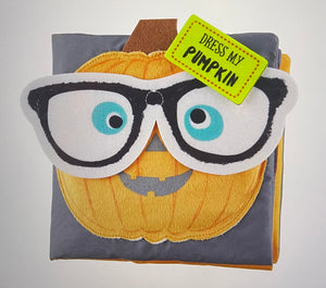 Get ready to dress your pumpkin with our Dress My Jack-O-Lantern Book. The soft baby safe book features illustrated pages. The pages feature a story about carving a pumpkin. The book includes seven felt pieces for accessorizing the large jack-o-lantern inside including glasses!