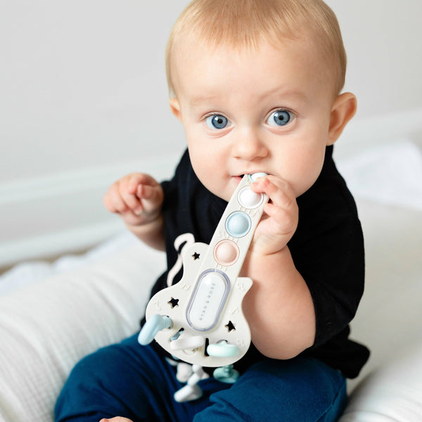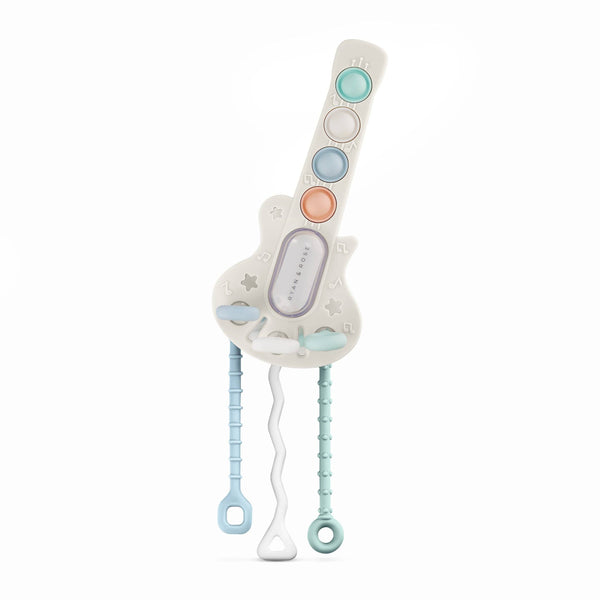 Constructed from 100% safe materials, this portable toy has flexible, soft edges that are easy for little hands to grasp and explore while supporting fine motor development, sensory exploration, and hand-eye coordination. With its compact, easy-to-clean design, the Rockin’ Guitar Toy is perfect for at home or on the go, ensuring continuous entertainment and stimulation. As they strum, pop, and explore, this interactive toy helps nurture a love for music from an early age, making it a great choice for all babies.
