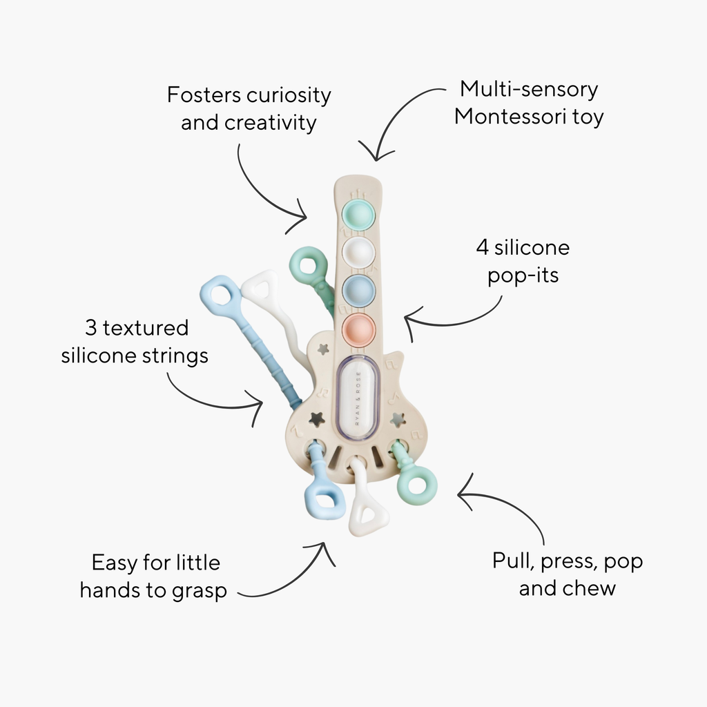 This multi-sensory Montessori toy is an excellent choice for teething babies, offering various ways to engage, including pulling, pressing, popping, and chewing. Featuring three textured silicone strings, four colorful pop-its, and a built-in mirror, the Rockin’ Guitar Toy is thoughtfully designed to stimulate vision, attract attention, and promote color learning, all while fostering both curiosity and creativity.