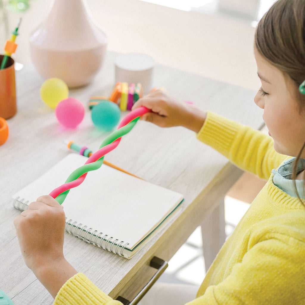 Stretch away stress! These squishy strings can stretch over 3 feet long and be twisted and twirled around hands and fingers for uniquely satisfying stimulation. This quiet activity builds finger, hand and arm strength while relieving tension in your neck and shoulders.