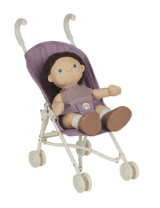 The stroller has a metal and plastic frame, and the seat is quilted 100% cotton and 100% polyester fibre.