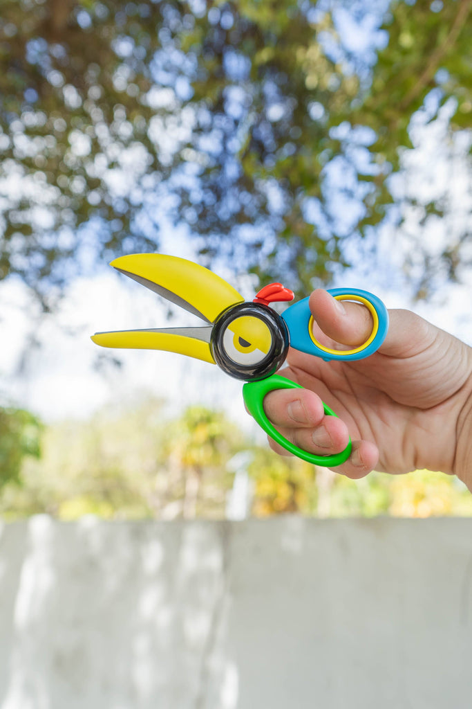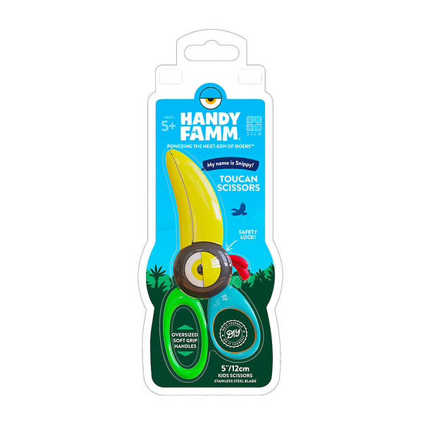 The Handy Famm Toucan Scissors are perfect for all DIY needs, combining fun design with practical functionality. Featuring stainless steel blades for straight cutting, they are ideal for a variety of projects. The oversized soft grip handles ensure comfort for little hands, while the built-in safety lock above the eye provides added security when not in use.